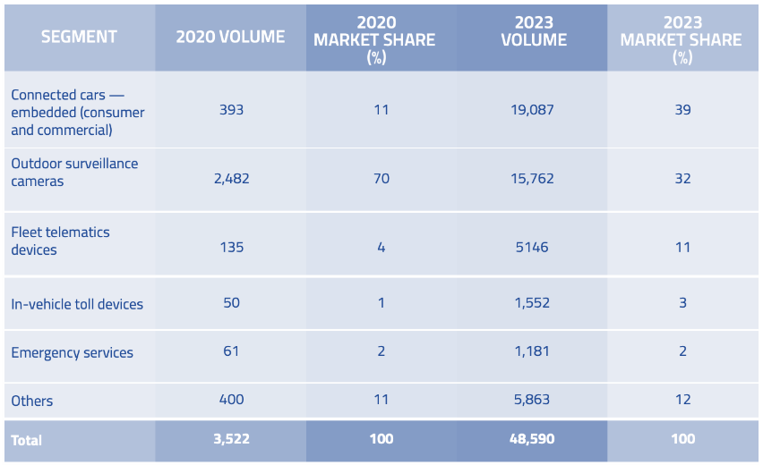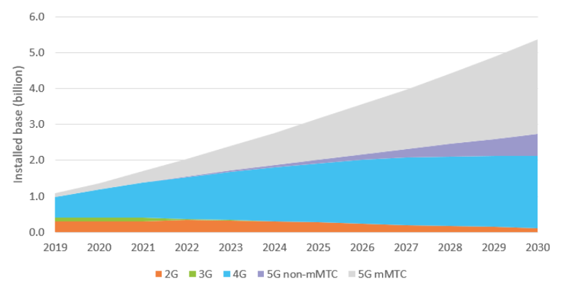 5G'nin yaygınlaşması, IoT pazarının daha da büyümesini ve kullanımının artmasını sağlayacak. Hücresel veri kullanan IoT cihazlarının mobil şebeke teknolojilerine göre dağılımını görebiliriz.